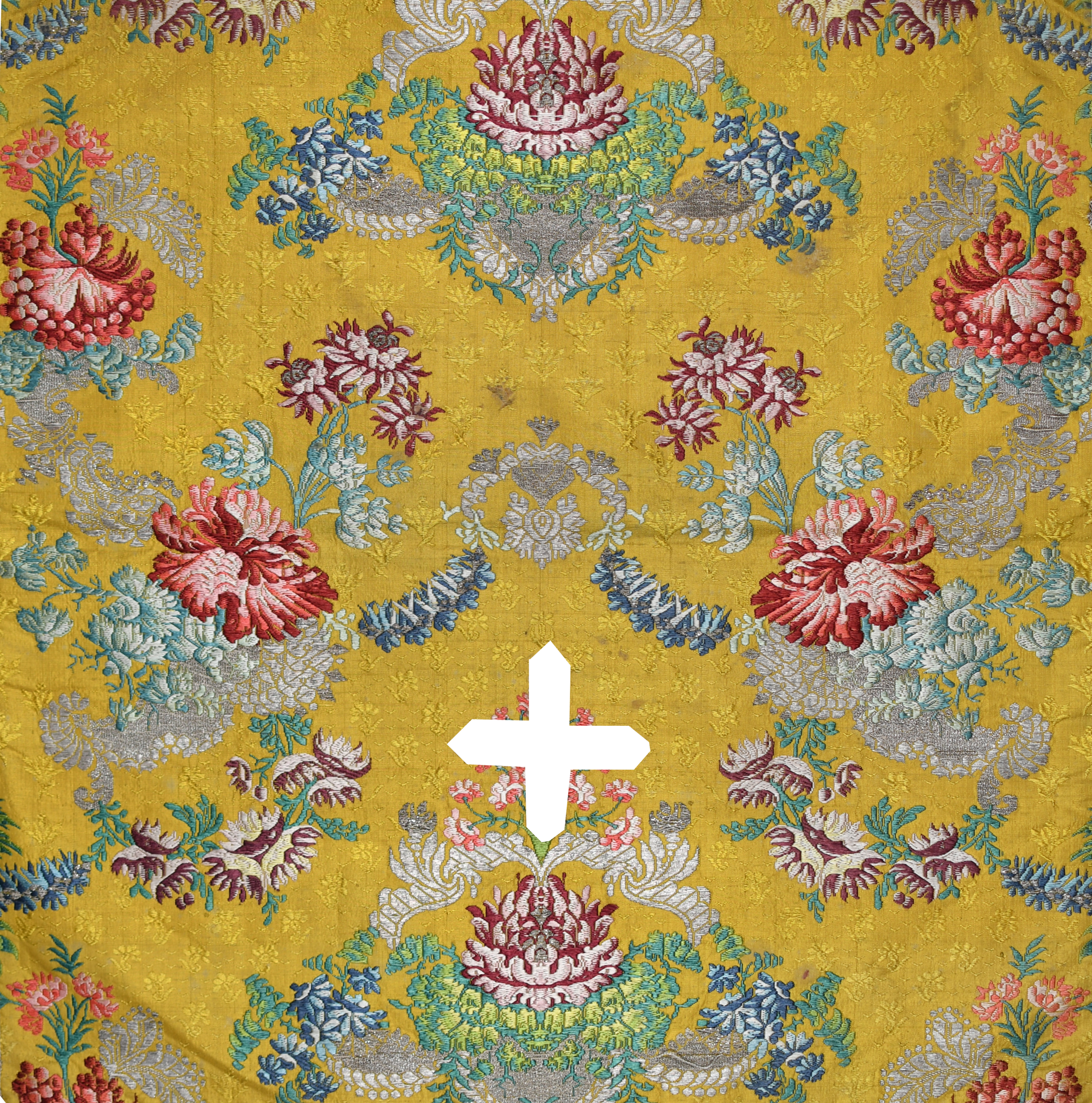 Dostava: réduction de chaînes: 60 nití/cm. Útky v passée: Základní útek, liseré útek, broché útek I, broché útek II, broché útek III a broché útek IV. Technický raport: (v. 39,5 cm, š. 26,5 cm) je jedenkrát zrcadlen v šíři tkaniny. Découpure: 4 osnovní nitě, 1 passée.