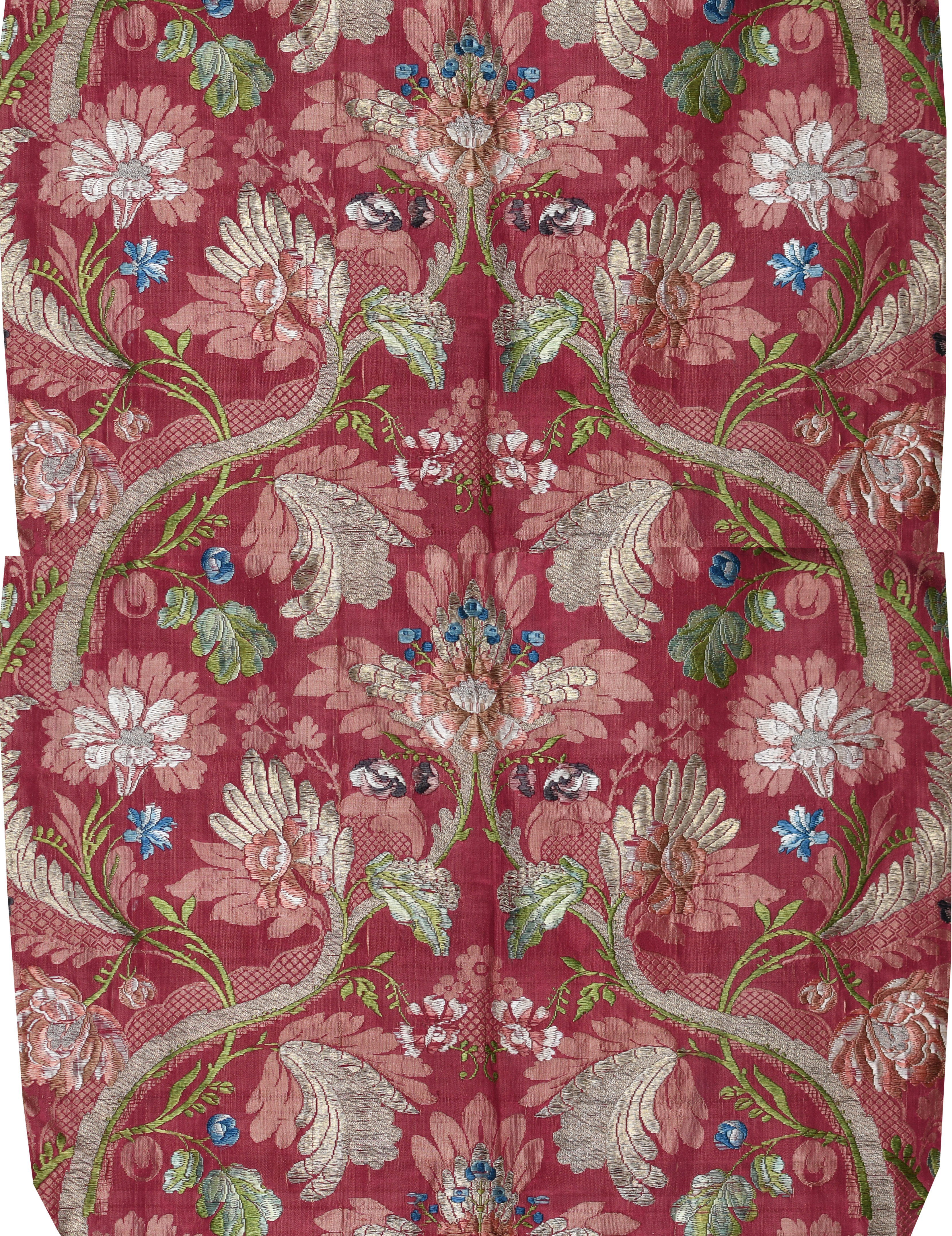 Dostava: réduction de chaînes: 172 nití/cm. Útky v passée: Základní útek, lancé útek, broché útek I, broché útek II a broché útek III. Technický raport: (v. 26,5 cm, š. více než 24 cm) je jedenkrát zrcadlen v šíři tkaniny. Découpure: 5 osnovní nitě, 1 passée.